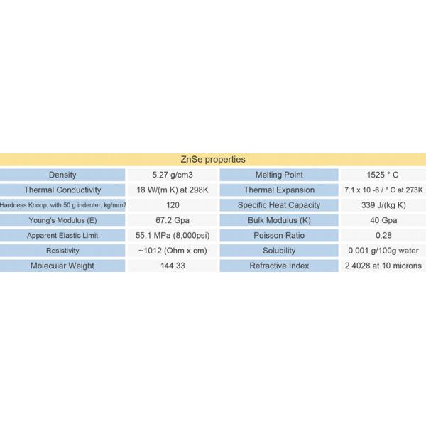 Zinc Selenide Windows (ZnS Windows) are perfect for a wide variety of infrared applications including thermal imaging, FLIR, and medical systems. This chemical vapor deposited material has extensive usage in high power CO2 laser systems because of its low absorption coefficient and high resistance to thermal shock. Zinc Selenide (ZnSe) is a relatively soft material that scratches easily, and it is not recommended in harsh environments because its Knoop Hardness is only 120.